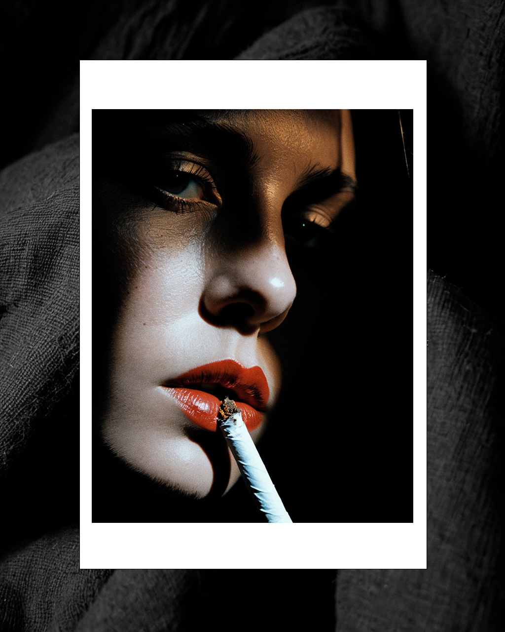 Un regard brûlant, une flamme éteinte au bout des lèvres. La fumée n’est plus là, mais l’attente persiste. Dans cette lumière rasante, la peau devient scène, les lèvres deviennent promesse. Rien ne crie, tout chuchote — entre provocation et lassitude, entre feu et cendre.