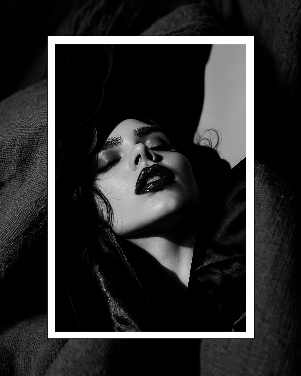 “Sillage d’Ombre” capture un instant suspendu, un souffle entre ombre et lumière. L’expression, sensuelle et énigmatique, évoque un abandon à l’instant présent, comme si le temps avait cessé de s’écouler. L’inspiration naît d’un jeu d’ombres sculptant le visage et le tissu satiné, créant un dialogue visuel entre douceur et intensité.